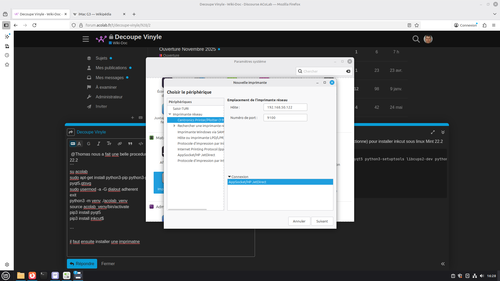 Allumer la machine et lancer une recherche d’imprimante. L’imprimante est trouvée à l’URI 192.168.1.203:9100