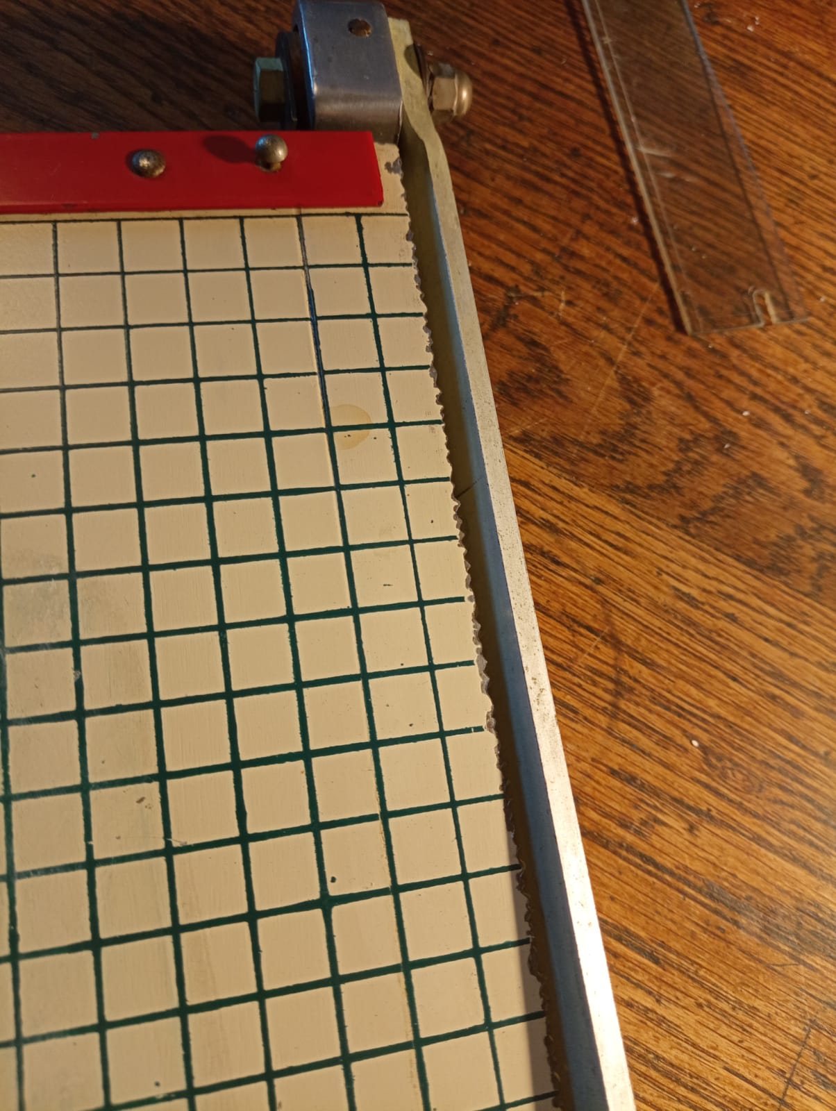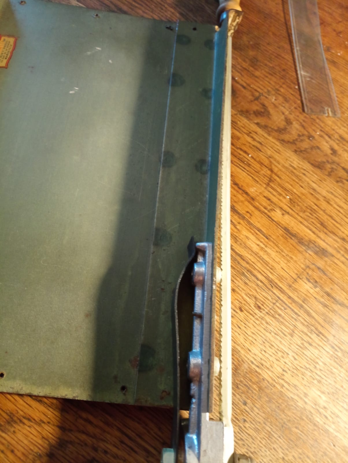Je viens de m’offrir (pour 3fois rien) une merveille de petit massicot ancien dentelé je dirais en acier (à l’origine fait pour les photos anciennes)