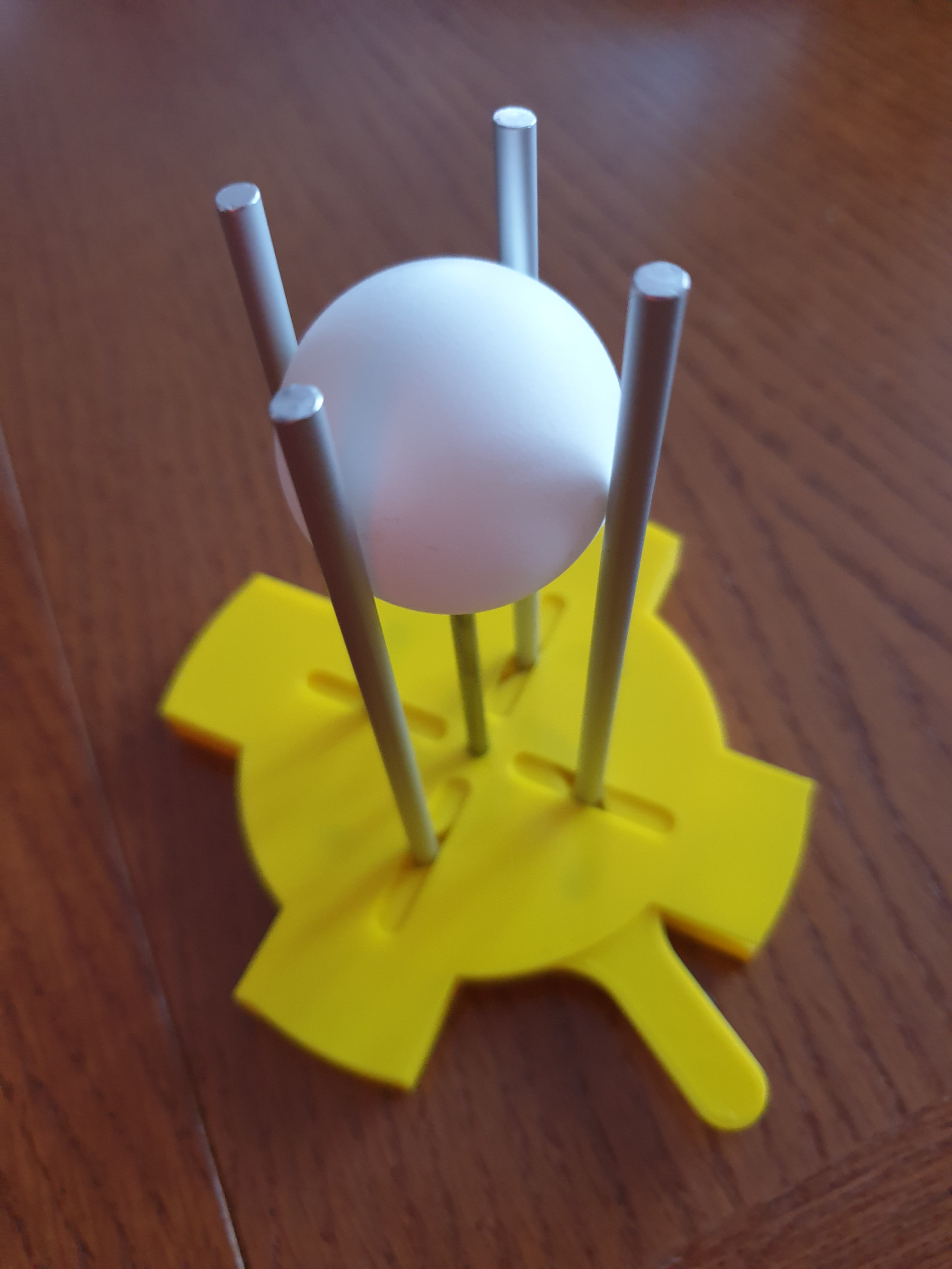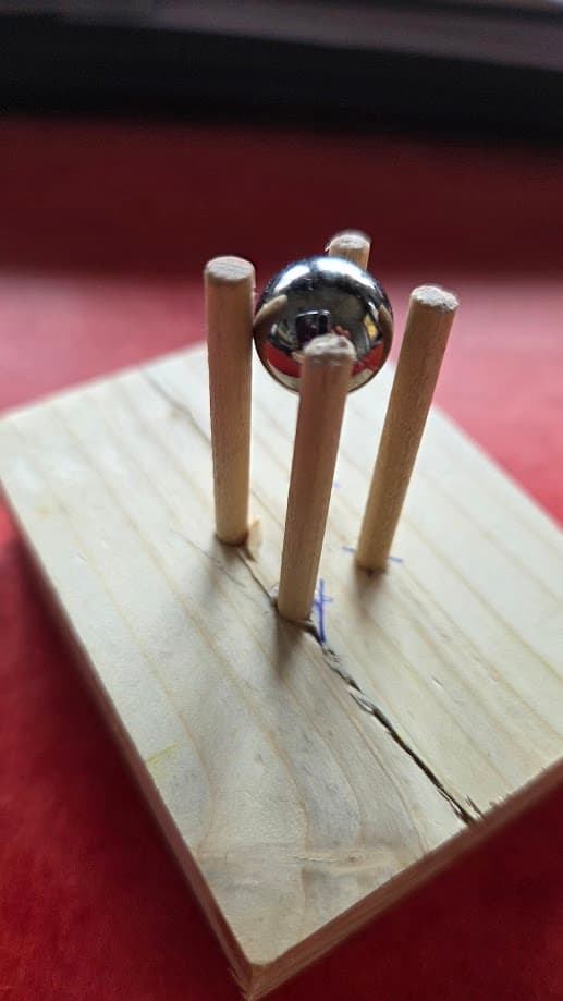 4 fines tiges en carbone ou fibre de verre plantées dans un bout de bois avec plusieurs écartements : leur flexibilité permet de s’adapter à différents diamétres de boule et de les serrer, 4 bouts de durite silicone enfilées dessus pour donner du grip et hop !