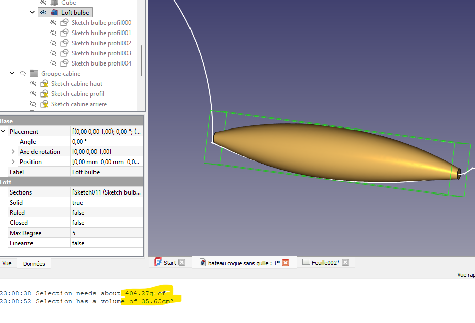 Pas loin des 404 g théoriques avec une “face cachée” pas terrible … sur le forum des voileux anciens ils parlent aussi de 800 g mais samedi un devis de poids rapide avec 404 g -et sans le gréement- montrait une ligne de flotaison assez haute … avec du bois léger et une coque pleine ![]()