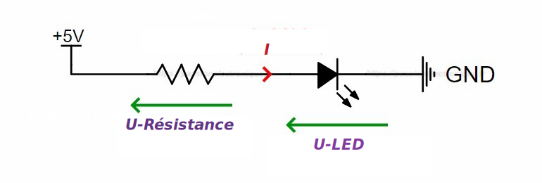 Avec la résistance en série avec la led, quand l’ensemble est parcouru d’un courant, la tension aux bornes de la led va s’établir à U_led à partir du moment ou le courant I est dans la limite acceptable.